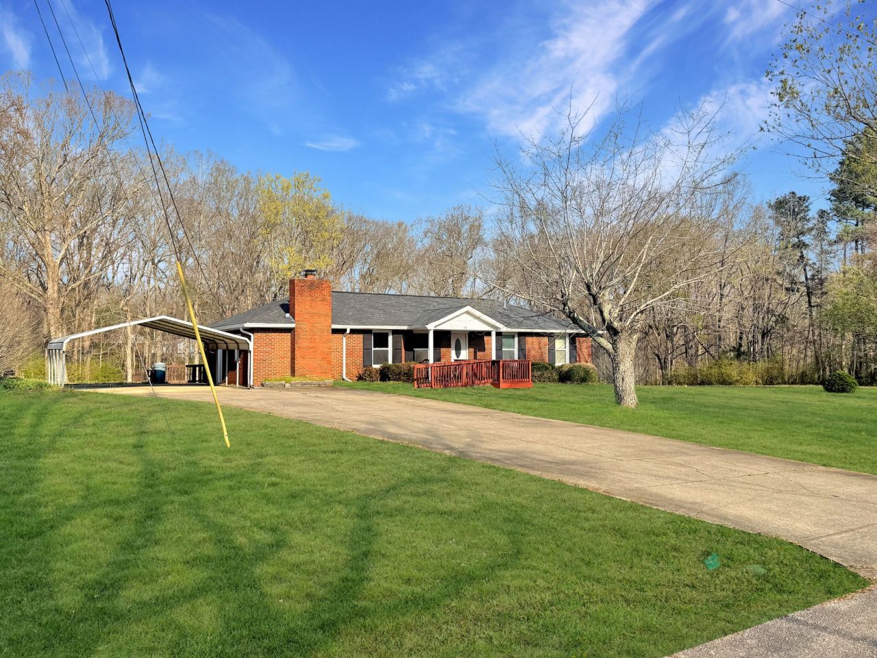 Welcome to this charming all-brick, one-level home nestled on a spacious 1+/- acre lot in the established Towering Oaks community! Offering approximately 1,500 sq ft of living space, this well-maintained home combines classic character with thoughtful updates throughout. Step inside to find fresh flooring and updated paint that create a bright, inviting feel. The cozy living room features a beautiful brick fireplace. The kitchen offers ample cabinet space, updated appliances, and a functional layout with easy access to the dining area. The home includes 3 bedrooms and 1.5 bathrooms, beautifully updated walk-in tile shower in the primary bath. A convenient laundry room adds to the home's practicality. Outside, you'll love the large, level yard. Ideal for outdoor activities, gardening, or simply enjoying the peaceful surroundings. The property also features a detached carport, storage building, and plenty of space for additional parking or equipment. Located in a quiet setting with a paved driveway and rolling landscape, this property offers the perfect balance of privacy and convenience. Don't miss your opportunity to own this move-in-ready home with space, charm, and updates already in place!